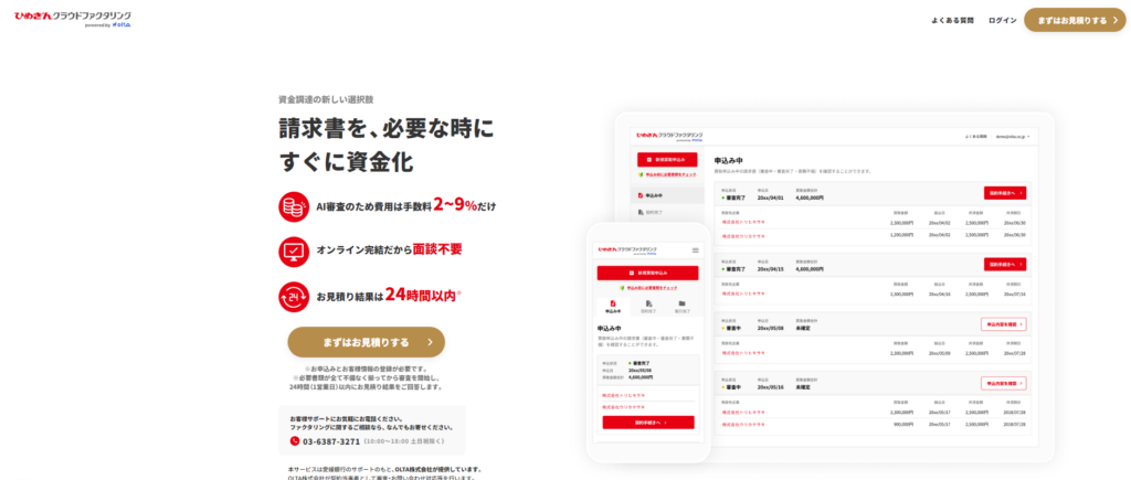 サービス内容はOLTAのクラウドファクタリングと同等で、手数料は2%~9%、買取金額に上限・下限の設定はなく、個人事業主・法人どなたでも利用可能です。申込みから最短即日で請求書を資金化でき、すべての手続きがWeb上で完結します。