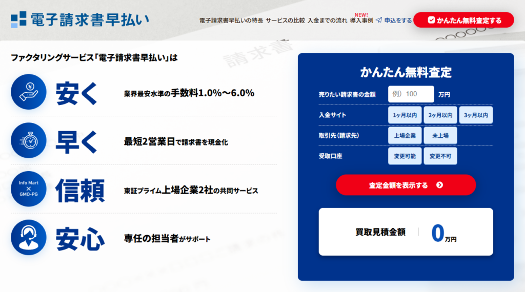 GMO BtoB 早払いは、東証プライム上場企業であるGMOペイメントゲートウェイ株式会社が運営するファクタリングサービスです。手数料は1%〜で、上場グループならではの信頼性と低コストが魅力です。